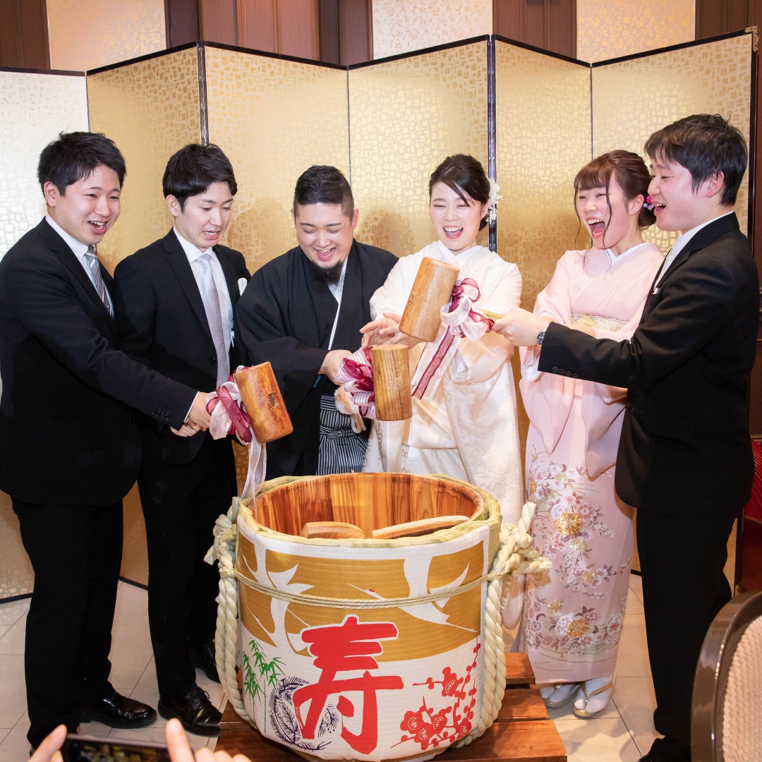 鏡開きで樽酒を振る舞い、シェフと相談した私達の披露宴のためだけのメニューでおもてなしできました。
